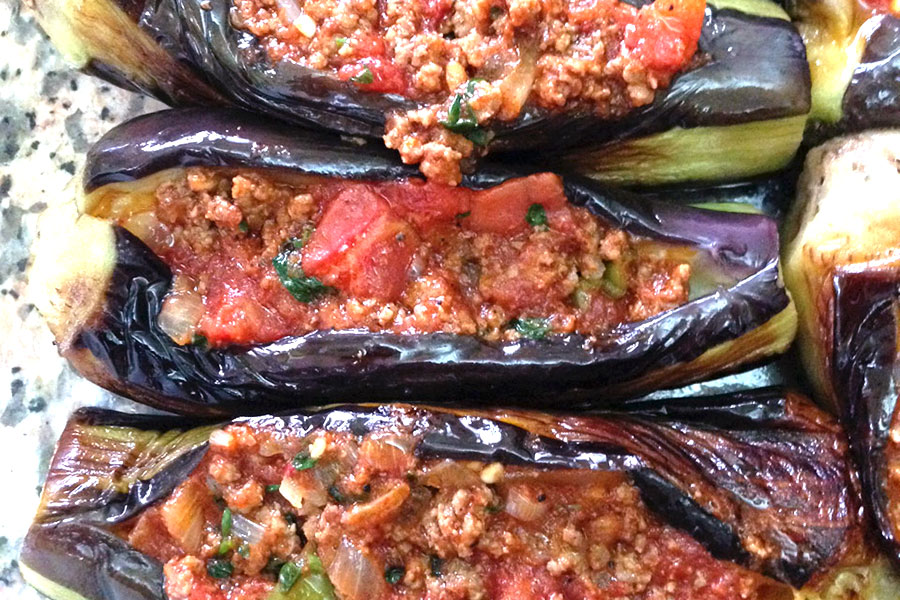 Stuffed eggplant with onions, garlic, mincemeat and tomatoes